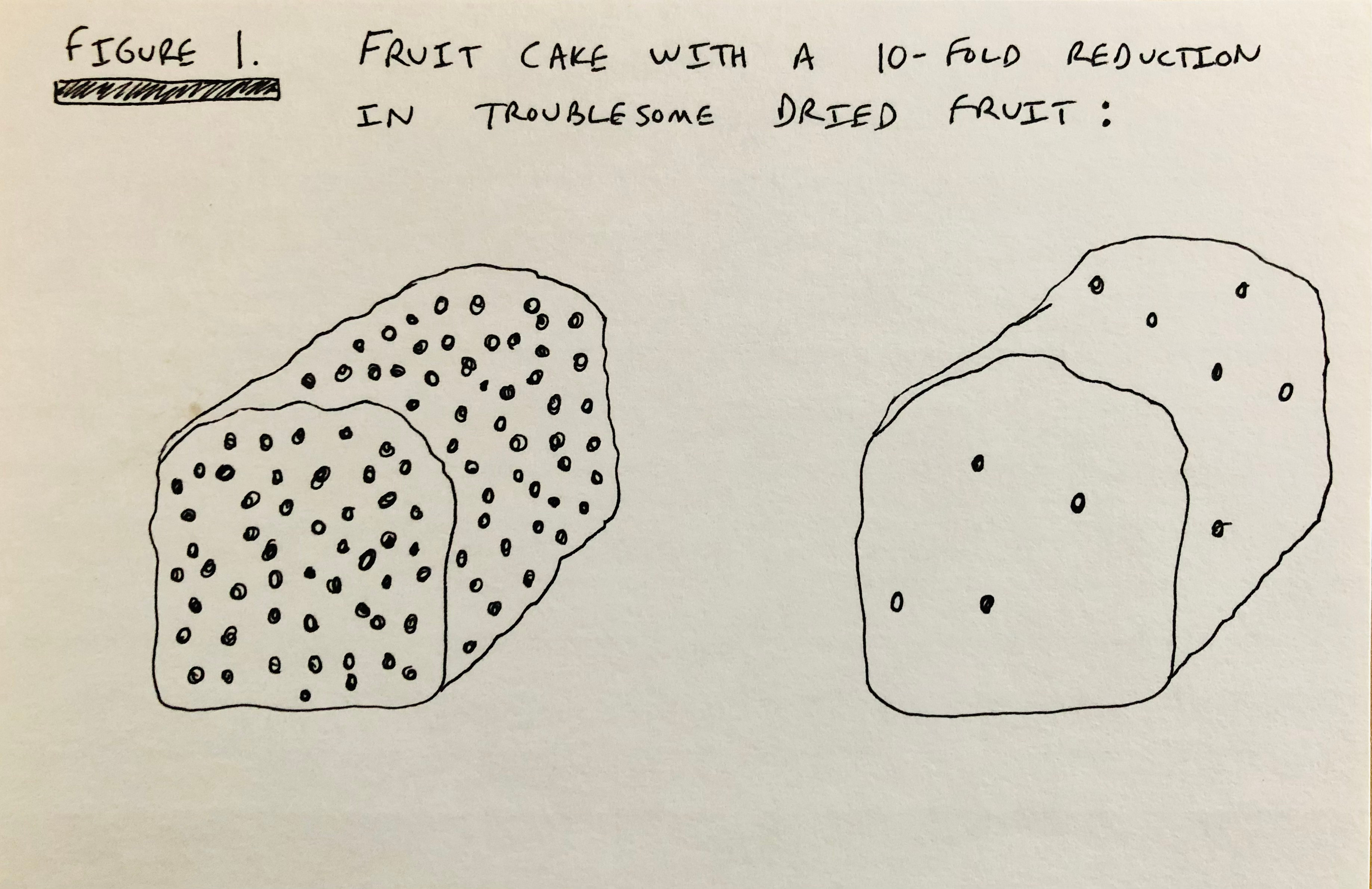 Yet I also suspect it will decrease the frequency and severity of long Covid (that nasty lingering array of possible symptoms like fatigue, cough, shortness of breath, cognitive problems, muscle weakness, and pain just to name a few). Paxlovid reduces viral loads in the body by 10-fold, and we are learning that part of long Covid pathogenesis is direct cell invasion by the virus… so it would make intuitive sense that reducing the amount of virus early in infection, and helping the body to clear it out faster, might help low, average, and high risk individuals avoid long Covid. Here is a very professional rendering of what 10-fold reduction looks like in a fruit cake:
